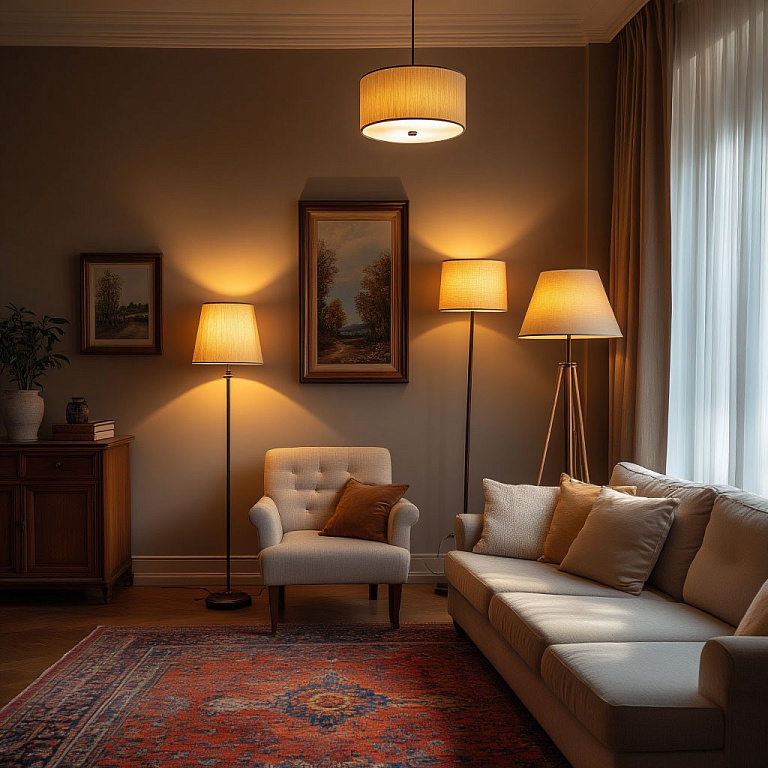 - Как избежать: Создайте многоуровневое освещение. Комбинируйте потолочные люстры, торшеры, настольные лампы и подсветку. Каждый источник света должен выполнять свою функцию. Регулируемое освещение позволит создавать разное настроение в течение дня.