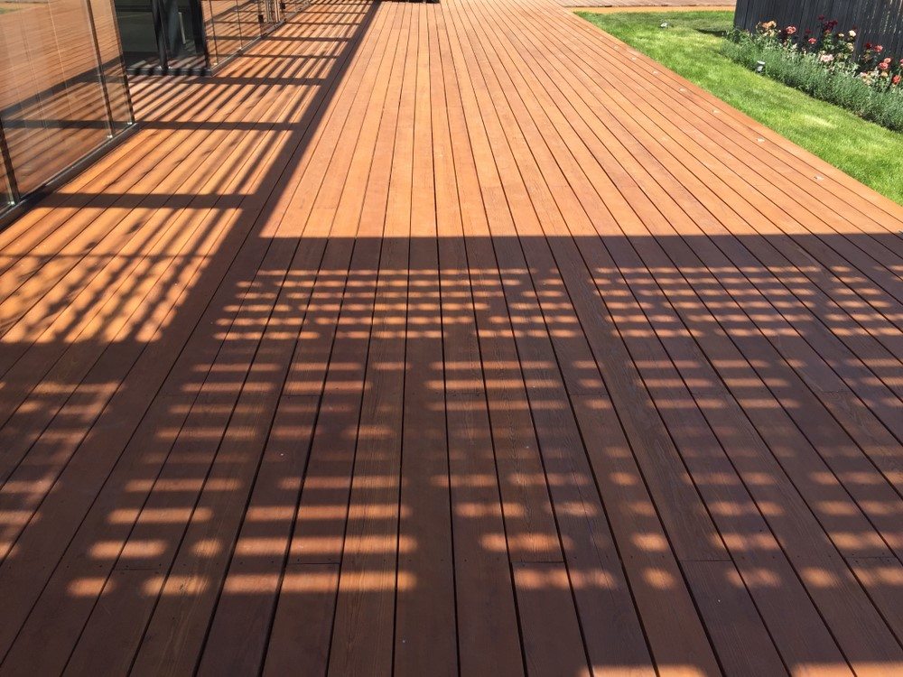 А для тех, кто ценит инновации, есть термодревесина. Это один из вариантов ответа на вопрос: Из чего делают террасную доску?» Обычное дерево подвергают высокотемпературной обработке, благодаря чему оно может применяться в условиях повышенной влажности и теперь его основная характеристика — это прочность, а также влагостойкость и долговечность