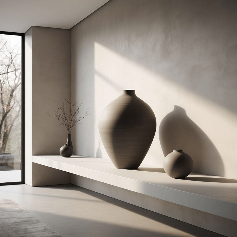 - игра контрастов (например, матовая штукатурка в паре с текстилем или керамикой) для создания объемного эффекта;