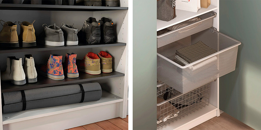 - Выдвижные ящики, коробки для хранения и мелкосетчатые корзины — универсальное решение для хранения белья, носков, аксессуаров, мелких предметов.