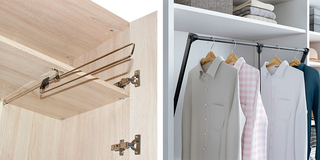 - Штанги лучше располагать на высоте 100–120 см, для длинной одежды — выше 140 см. Если шкаф высокий, установите пантограф - подъемный механизм, который позволяет опустить штангу.