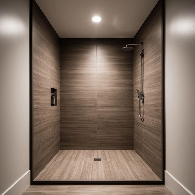 - Душевая зона: Облицовка душевой кабины плиткой под дерево создает необычный акцент. Если поддон выполнен из того же керамогранита, что и пол, это может создать эффект единого пространства (важно учитывать региональные особенности согласования таких решений).