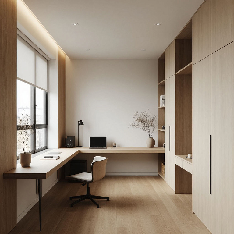 - Освещение и многослойность: Светильники с регулируемой цветовой температурой (холодный свет для концентрации, теплый – для уюта) и светодиодные ленты создают нужную атмосферу и визуальную легкость. Игра с фактурами, оттенками и сочетание матовых/глянцевых поверхностей придают глубину даже компактному пространству.