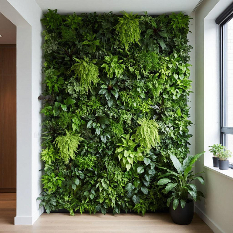 - Вертикальное озеленение: Этот подход является эффективным решением для помещений с ограниченной площадью. Вертикальные сады могут представлять собой как масштабные “живые стены”, так и более простые конструкции для размещения ампельных растений.