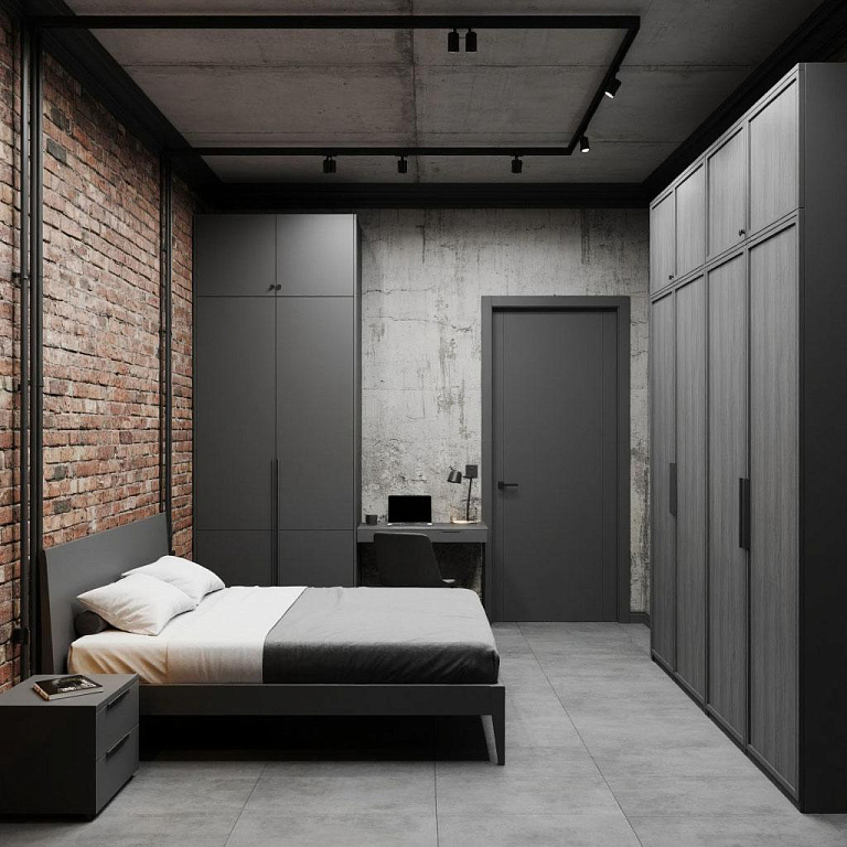 - Вместо гипсокартона и обоев — кирпич и бетон;