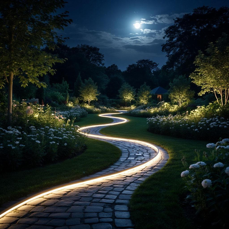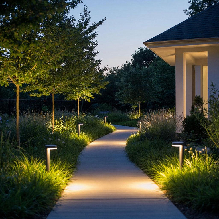 Освещение дорожек — это не только функциональное решение, но и способ добавить эстетическую привлекательность вашему саду. Используйте низкие светильники, встроенные в землю, или светящиеся камни, чтобы создать безопасные и эффектные маршруты для вечерних прогулок.