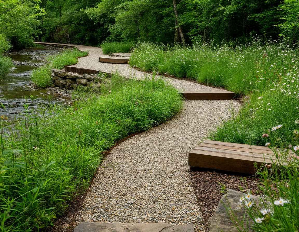 Откажитесь от идеи закатать все в асфальт. Дождь должен не скатываться в реку грязными ручьями, а уходить в землю, питая водоносные слои. Ваши лучшие друзья здесь — природные материалы: